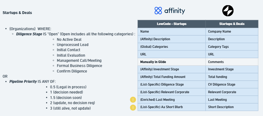 The final deliverable is a visual mapping table showing side-by-side field alignment between the external source and the platform, including logic notes (e.g., โ ๏ธ conditional filters, manual steps).