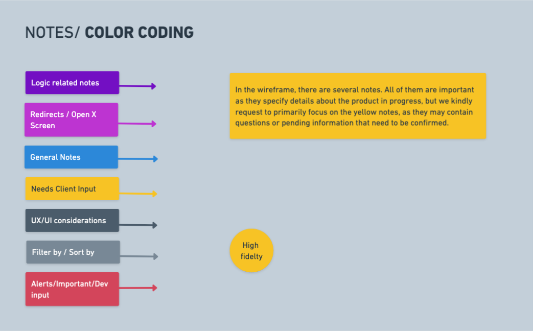To maintain a structured and clear representation of project statuses, notes, and screen flows through color coding. This ensures all team members and clients can easily understand and track the progress and requirements of the wireframes.