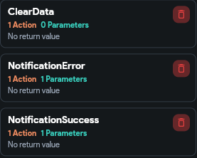 - Below are the de default action blocks that are required when setting up the project: ClearData, NotificationError, and NotificationSuccess