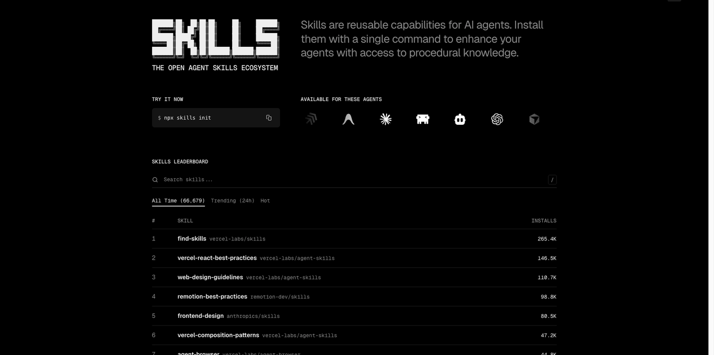 The Skills ecosystem (skills.sh) is an open directory and package manager for these skills, letting you browse, install and share them with a single install command.