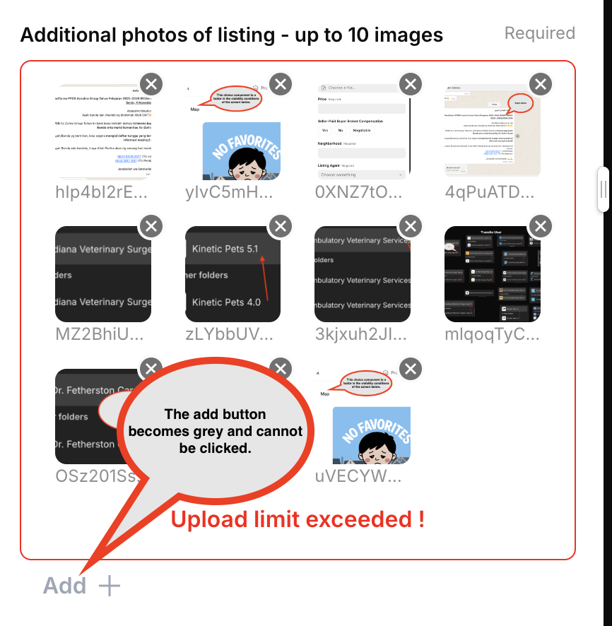 #page-root:has(.limitToUpload [data-testid="picker-image"]:nth-child(11)) [aria-label="Submit"], #page-root:has(.limitToUpload [data-testid="picker-image"]:nth-child(11)) .minimalPrimary {pointer-events: none;opacity: 0.4;} #page-root:has(.limitToUpload [data-testid="picker-image"]:nth-child(11)) .limitToUpload .component-root > div > div > div:nth-child(2){border:1px solid red;} #page-root:has(.limitToUpload [data-testid="picker-image"]:nth-child(11)) .limitToUpload .component-root > div > div > div:nth-child(2):after{content:"Upload limit exceeded !";display: flex;padding-top: 10px;color: red;justify-content: center;font-weight: 600;}